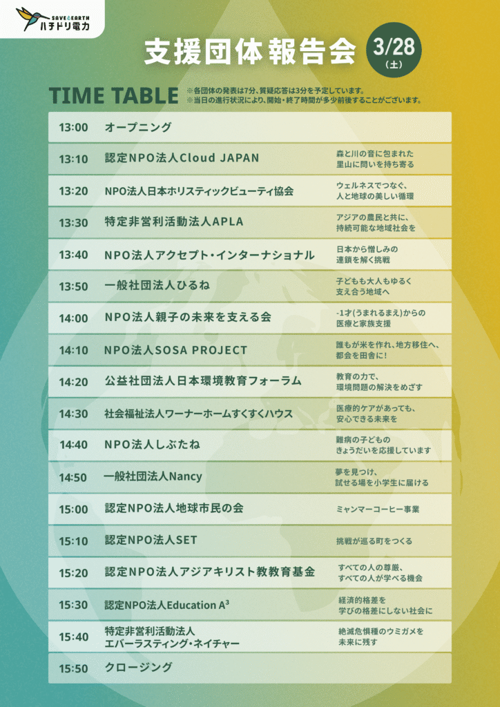 - CO2排出実質ゼロの自然エネルギー100%を供給するハチドリ電力さん。電気代の1%を自然エネルギー発電所の増設に、さらに1%をNPOなどへ寄付する「ひとしずくアクション」を行ってくださっていて、しぶたねも支援先に選んでいただいています。毎月の電気代から活動を応援してくださっているみなさまいつもありがとうございます。